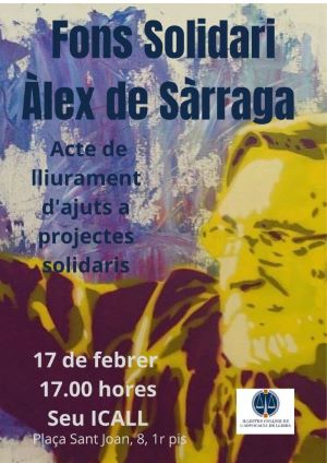 El DIMARTS, 17 DE FEBRER DE 2026, A LES 17.00 HORES, tindrà lloc a la Sala d'actes del Col·legi, l'acte de lliurament del Fons Social Alexandre de Sàrraga a la Solidaritat de l'any 2025 a entitats sense ànim de lucre.